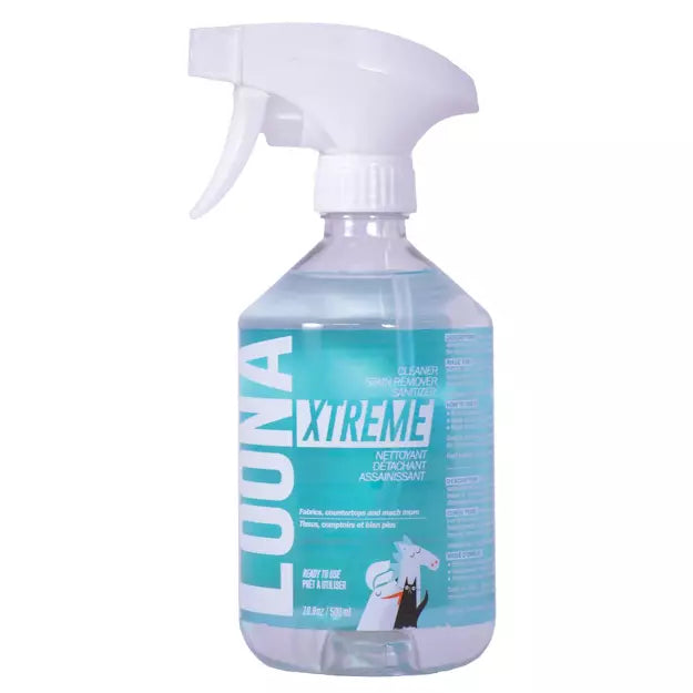 LOONA XTREME CLEANER SANITIZER Stain remover for fabrics and counters. Antibacterial, ideal for wet food bowls. Powerful sanitizing cleaner with activated peroxide. MADE FOR: sanitizing hard surfaces such as countertops, stainless steel, plastic, wood, ceramic and concrete surfaces. Recommended for removing stains from fabrics such as: clothes, chairs, sofas, rugs, mattresses and automotive interiors. Effectively replaces bleach in the washing machine.