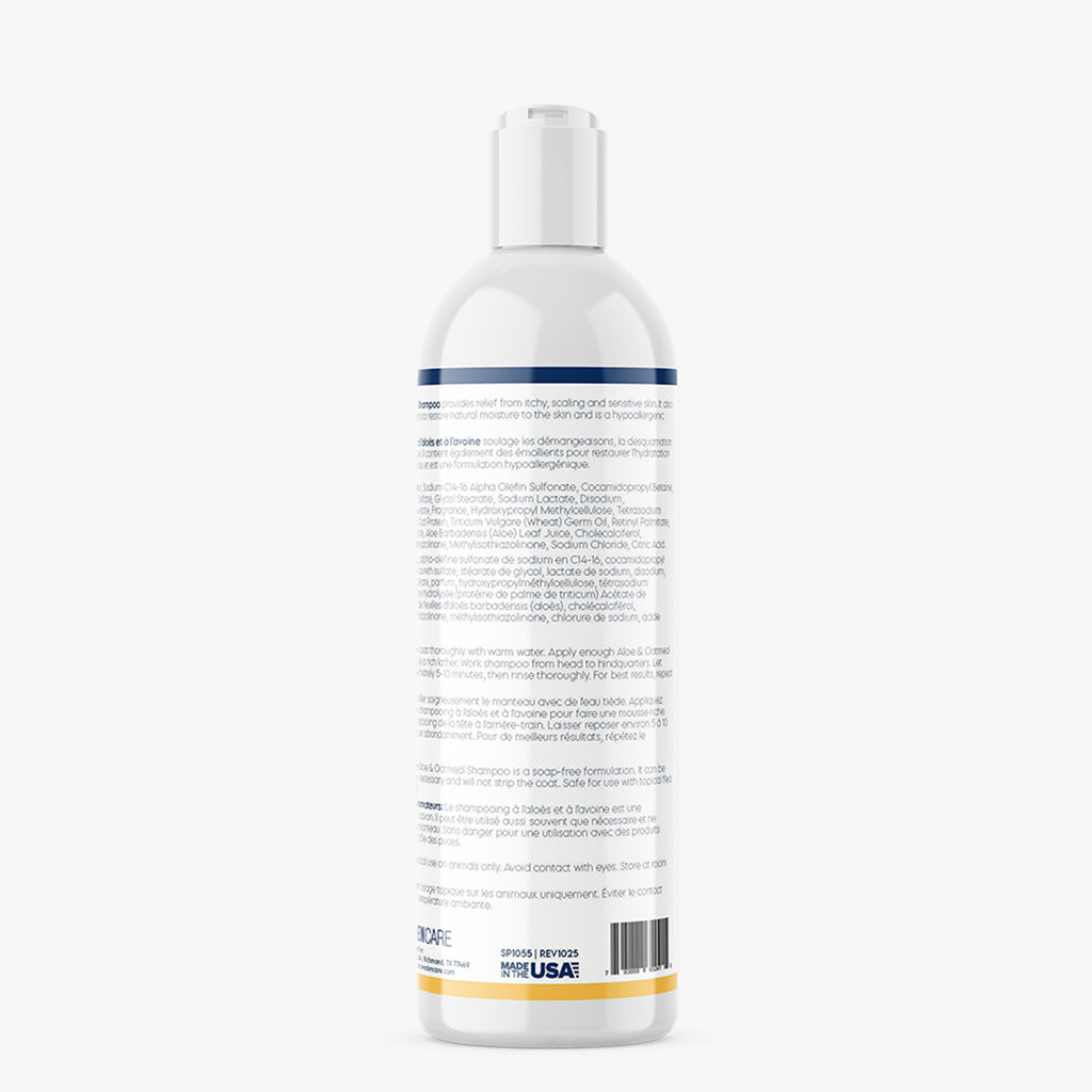 Wet coat thoroughly with warm water. Apply enough Aloe & Oatmeal Shampoo to make a rich lather. Work shampoo from head to hindquarters. Let stand for approximately 5-10 minutes, then rinse thoroughly. For best results, repeat the process.