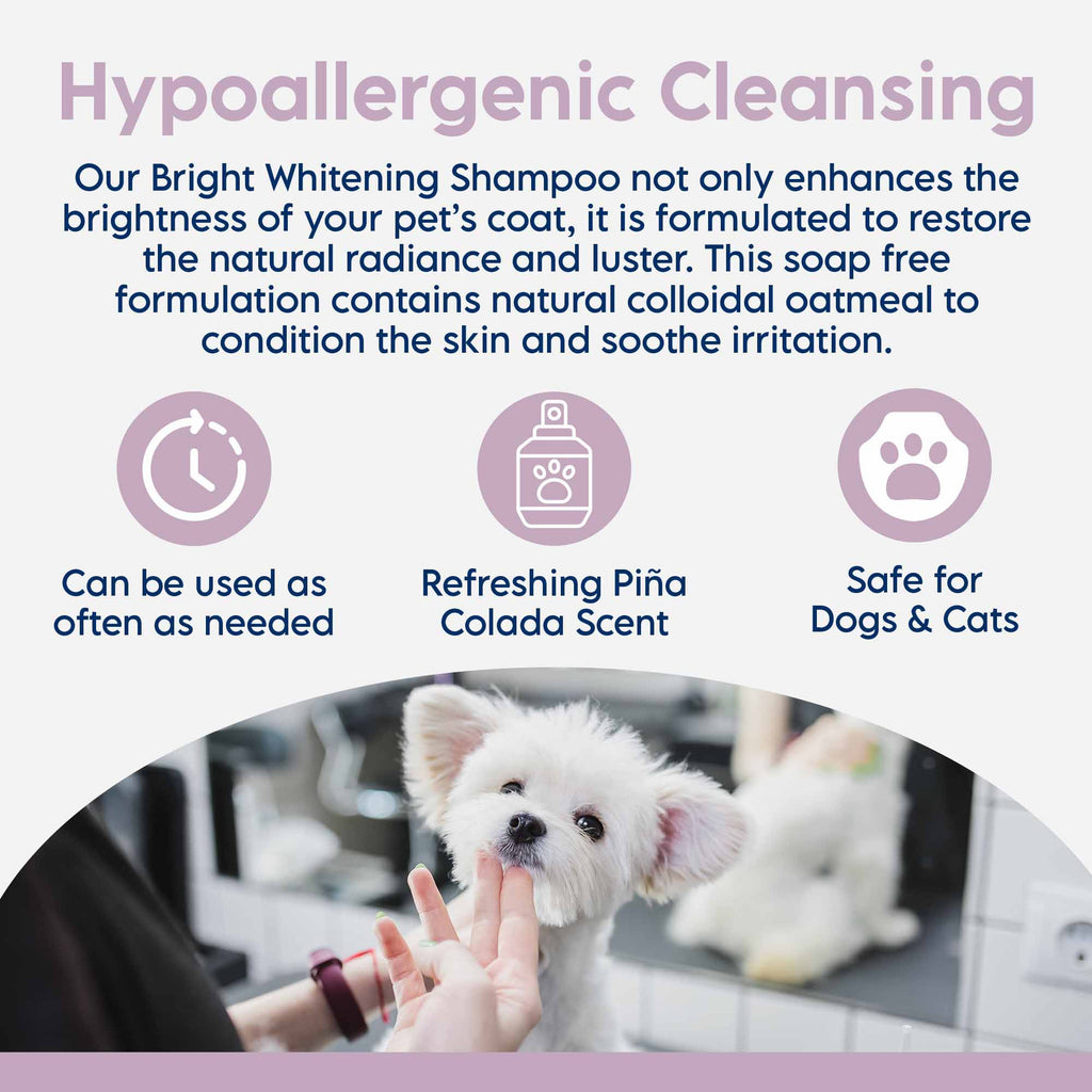 Lyxvara™ Bright Whitening Shampoo is here to make your pet's coat shine like never before! Our special formula not only brightens their fur but also brings back its natural glow and silky smoothness. Lyxvara™ Bright Whitening Shampoo contains whiteners that enhance the brightness of your pet’s hair coat and is formulated to restore its natural radiance and luster. Plus, with the added goodness of natural colloidal oatmeal, it's perfect for soothing their skin and making grooming a breeze. Your furry friend will look and feel amazing! Available as 12 oz.