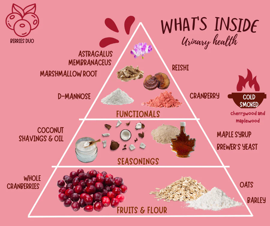 Cranberry, Oats, Brewer's Yeast, Coconut Oil, Barley, Coconut Chips, Maple Syrup, Reishi, Astragalus, Marshmallow, D-Mannose, Mixed Tocopherols (preservative), Citric Acid, Yeast, Smoke