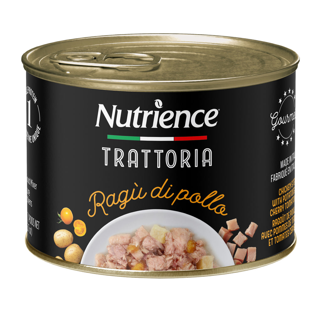 Turn every mealtime into an authentic Italian dining experience with Nutrience Trattoria Gourmet Chicken Ragu Dog Food Topper. Made in Italy with fresh, locally sourced ingredients, each recipe is crafted with love and tradition—no preservatives, artificial colours, or flavours, just 100% Italian goodness.With real, wholesome ingredients like chicken, potatoes, cherry tomatoes, and water—nothing more!—this single-protein topper is perfect for dogs with sensitivities. Simply mix it with kibble to boost hydration and flavour or serve it on a lick mat for a fun, engaging treat.Experience the true taste of Italy with every bite – indulge your dog in Chicken Ragu and let them savour the flavours of amore!