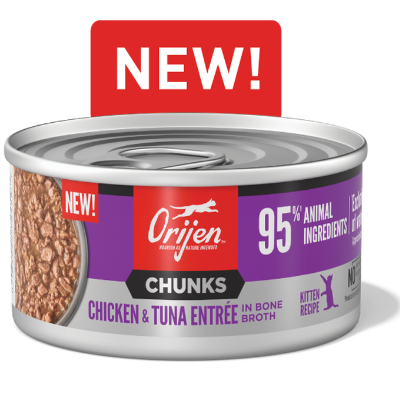 Nourish your kitten completely with the hearty WholePrey animal ingredients in ORIJEN™ Chunks Kitten Entrée! Kittens are obligate carnivores, meaning they thrive off a diet packed with real animal ingredients. That’s why our Kitten Entrée recipe is Biologically Appropriate and includes a whopping 95% animal ingredients1, including chicken and tuna, to help support your growing kitten’s muscle development. This diet also includes succulent WholePrey ingredients like chicken liver to provide your kitten with the nutrients they need to grow up strong. Kittens need to stay hydrated to thrive, and bone broth helps add necessary moisture to their diet with every bite. Help support your kitten’s development with the variety of raw animal ingredients packed into every can of ORIJEN™ Chunks!
