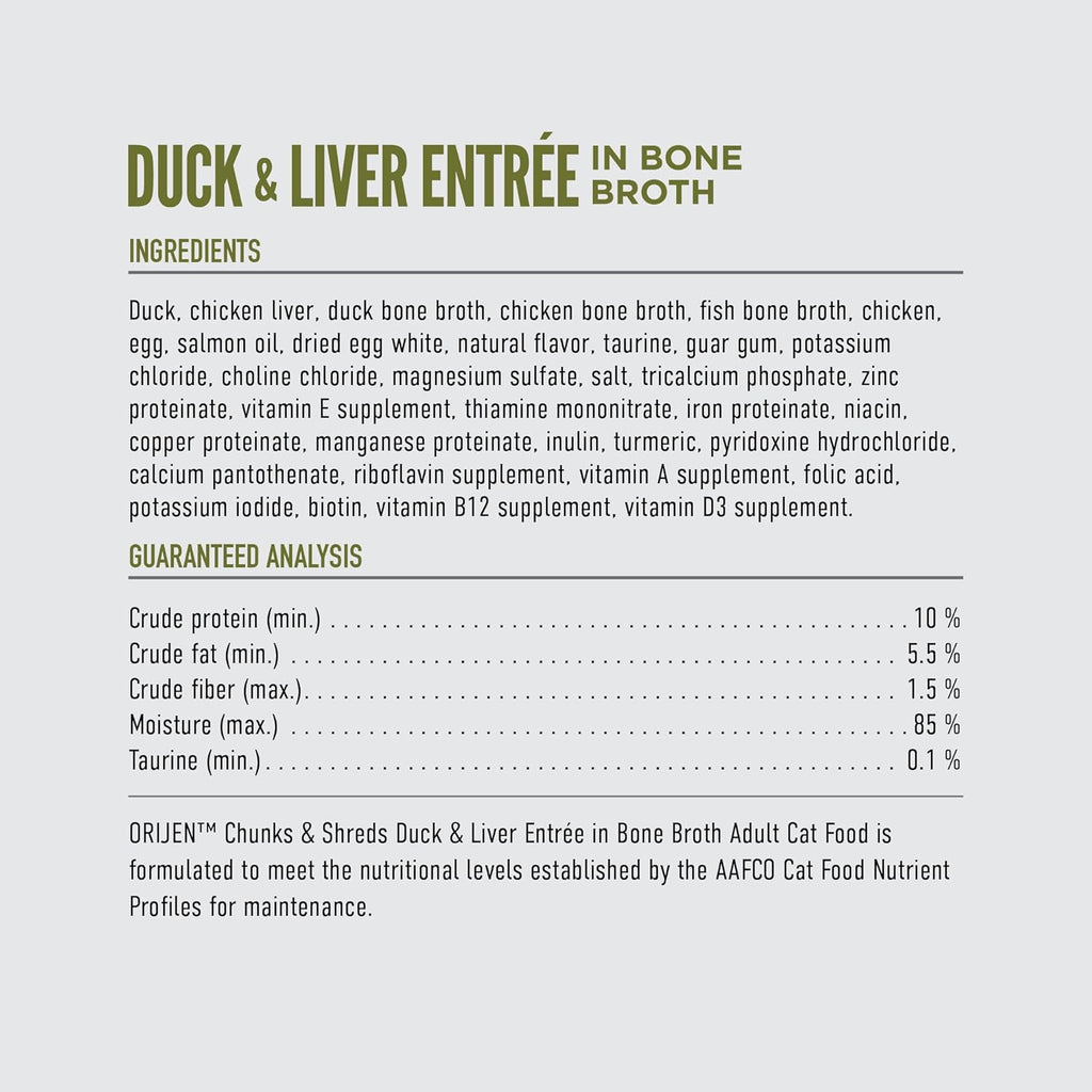 ORIJEN Chunks & Shreds Duck & Liver Entrée in Bone Broth Complete Adult Cat Food is formulated to meet the nutritional levels established by the AAFCO Cat Food Nutrient Profiles for maintenance.